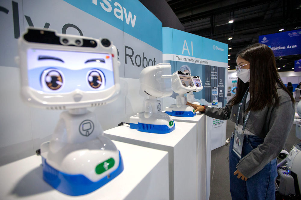 11月14日,在泰國首都曼谷,工作人員在APEC會(huì)議媒體中心與機(jī)器人互動(dòng)。新華社記者 王騰 攝