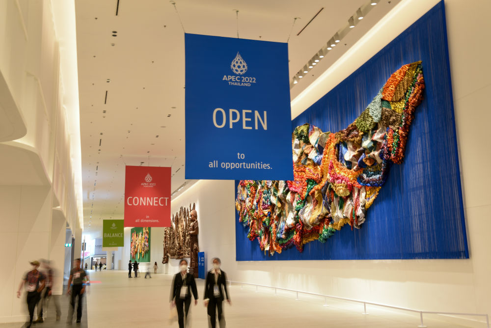 曼谷商業(yè)區(qū)的詩麗吉王后國(guó)家會(huì)議中心是亞太經(jīng)合組織第二十九次領(lǐng)導(dǎo)人非正式會(huì)議主會(huì)場(chǎng),藍(lán)、紅、綠三色標(biāo)語格外醒目,組成這次會(huì)議的主題“開放、聯(lián)通、平衡”。