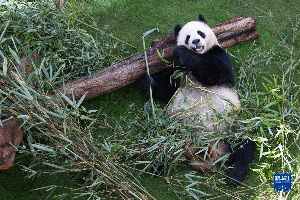 當(dāng)天在豪爾熊貓館,記者看到,兩只熊貓都有自己專屬的生活區(qū),空調(diào)恒溫,涼爽舒適,“京京”一直在吃新鮮的竹子,“四海”則更鐘愛爬樹。