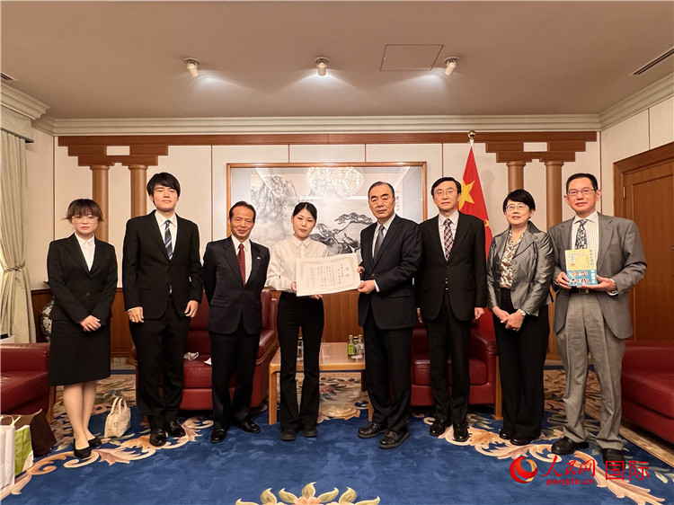 中國駐日本大使孔鉉佑向第五屆“日本人講中國故事”征文比賽部分獲獎?wù)哳C發(fā)獎狀。人民網(wǎng)記者 岳林煒攝