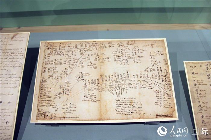 沈福宗的手繪中國(guó)地圖,復(fù)制自博德利圖書(shū)館,顯示了中國(guó)的主要城市和山川河流。人民網(wǎng)記者 邢雪攝 |