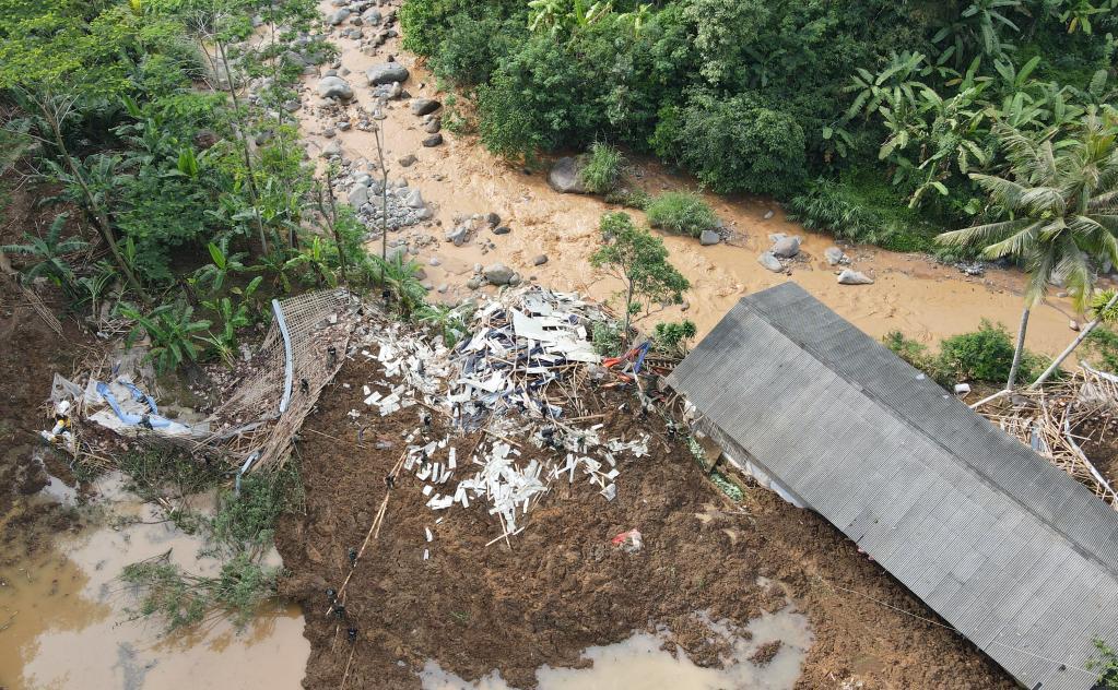 11月22日,救援人員在印度尼西亞西爪哇省展玉地區(qū)地震震中附近的山體滑坡現(xiàn)場開展救援(無人機照片)。新華社記者徐欽攝