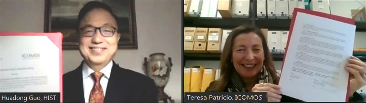 HIST主任郭華東院士與ICOMOS主席特蕾莎·帕特里西奧博士簽署合作備忘錄。HIST供圖