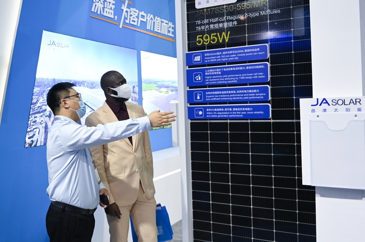 “光伏產(chǎn)品在塞內(nèi)加爾很有市場,我們那邊陽光充足,適合發(fā)展光伏發(fā)電?!痹谔柲茈姵亟M件生產(chǎn)商晶澳太陽能科技股份有限公司的展位前,塞內(nèi)加爾客商穆哈馬杜正饒有興致地和參展商交流。晶澳華東區(qū)銷售總監(jiān)韓國慶介紹,高品質(zhì)的太陽能電池組件在海外需求旺盛。