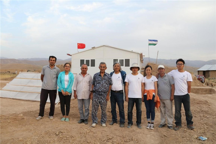 2016年撒扎干遺址保護(hù)大棚外,中烏考古隊(duì)員合影。王新建團(tuán)隊(duì)供圖