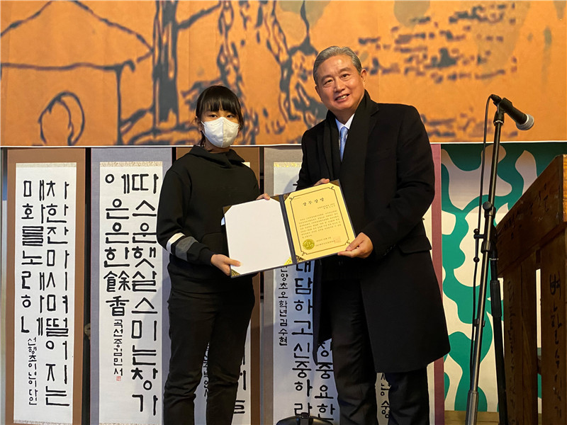 中國(guó)駐濟(jì)州總領(lǐng)事王魯新(右)為獲獎(jiǎng)選手頒獎(jiǎng)。中國(guó)駐濟(jì)州總領(lǐng)館供圖 |