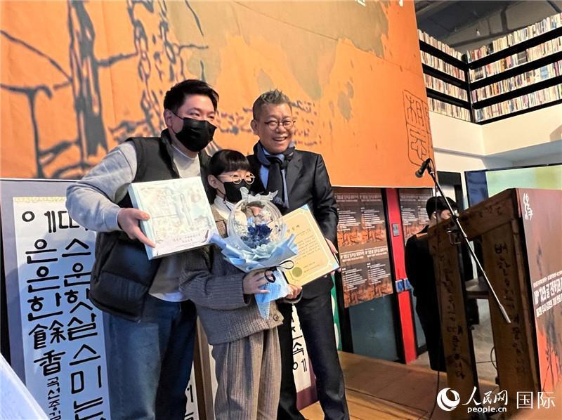 韓國(guó)國(guó)民統(tǒng)合委員會(huì)企劃委員長(zhǎng)、第二屆“秋史杯”中韓青少年書(shū)法大賽組織委員長(zhǎng)崔載千(右)為獲獎(jiǎng)選手頒獎(jiǎng)。人民網(wǎng)記者 馬菲攝 |