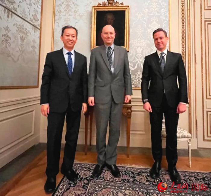 崔愛民大使(左)會見瑞典外交國務(wù)秘書克努特松(中)和瑞典外交部亞太司司長科旺斯特倫(右)。 人民網(wǎng) 王文 攝 |