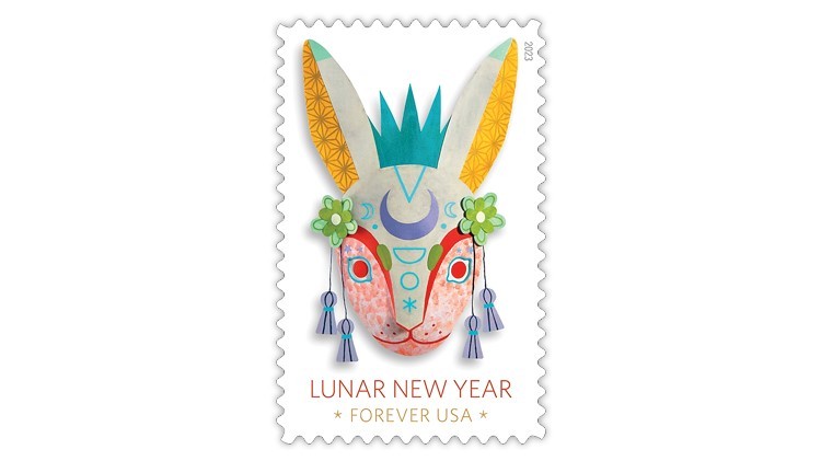 郵票上的小兔在兩只高聳的耳朵之間露出一頂綠色的王冠,額頭兩側的綠花上垂下四根紫色的流蘇,與前3年郵票上的流蘇一致。 從額頭到鼻梁的幾何圖形包括綠色的月亮和星星,讓熟悉中國文化的人很快想起民間傳說中月宮里的玉兔。美國郵政稱贊此款郵票:“使用傳統(tǒng)民間剪紙工藝對一年中這個吉時的當代詮釋”。