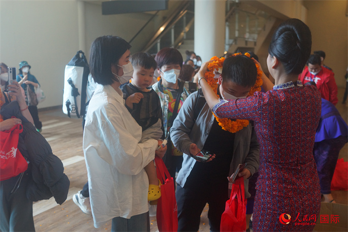 機(jī)場(chǎng)工作人員向中國(guó)游客獻(xiàn)上鮮花項(xiàng)鏈。人民網(wǎng)記者 張杰攝
