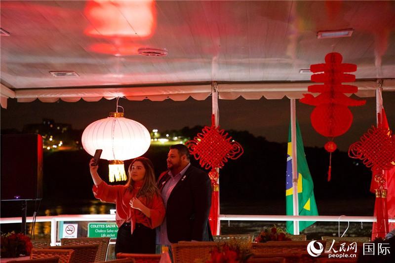 巴西民眾在節(jié)日裝扮的游船上合影慶元宵。人民網(wǎng)記者 畢夢(mèng)瀛攝 |