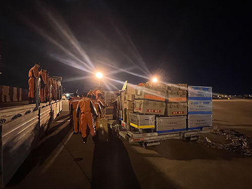 當?shù)貢r間2月8日凌晨4點30分(北京時間9時30分),中國救援隊一行82人經(jīng)過約10小時的飛行,抵達土耳其阿達納機場。隊長趙明介紹,根據(jù)當?shù)貙嶋H情況,中國救援隊立即開展卸貨轉(zhuǎn)運工作,盡快做好與我駐土耳其使館、當?shù)卣?、?lián)合國有關(guān)機構(gòu)對接,結(jié)合目前救援進展情況,接領(lǐng)具體搜救行動任務(wù),并擬派出救援小隊對執(zhí)行任務(wù)場地進行實地勘查,同時選擇安全合適的位置搭建營地。