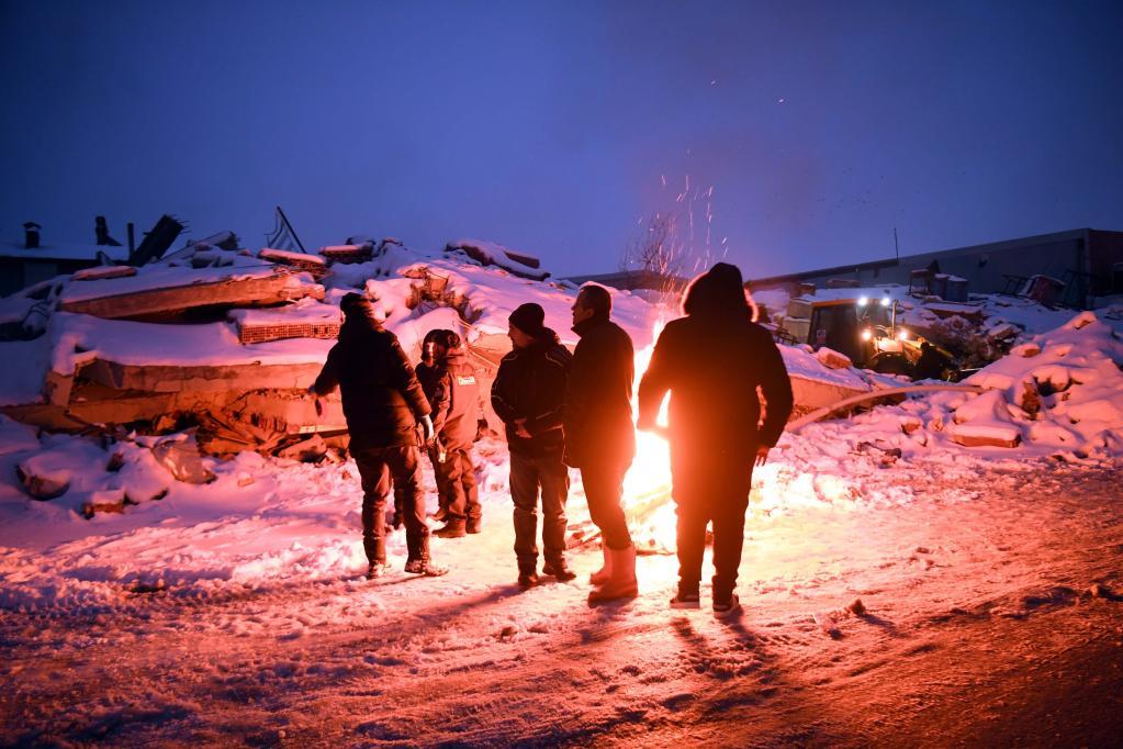 2月7日晚,在土耳其卡赫拉曼馬拉什省南部的埃爾比斯坦地區(qū),救援人員在廢墟旁燒火取暖。新華社記者沙達(dá)提攝