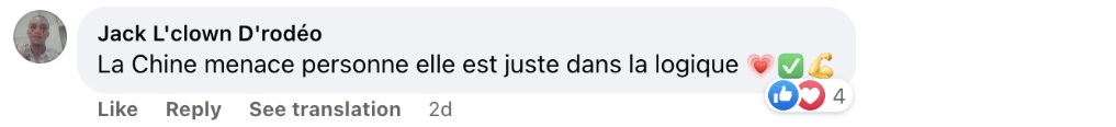網(wǎng)友杰克·羅德奧用法語留言說:“中國一心發(fā)展,不對任何人構成威脅?!?/p>