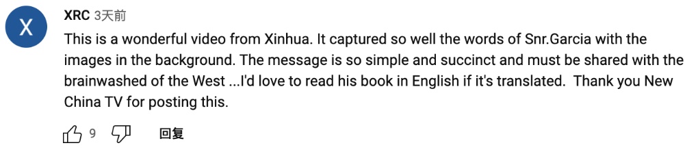 網(wǎng)友XRC留言說:“新華社這條視頻太棒了,它給我們傳達了一個明晰的信息,必須要分享給那些被洗腦的西方人看看。”