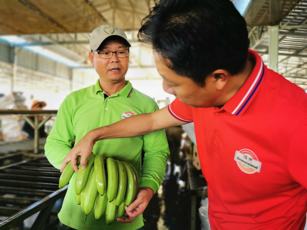 2020年7月16日,在柬埔寨桔井省的柬埔寨—中國(guó)熱帶生態(tài)農(nóng)業(yè)合作示范區(qū)內(nèi),綠洲農(nóng)業(yè)發(fā)展(柬埔寨)有限公司總經(jīng)理高冠華(右)和公司香蕉產(chǎn)業(yè)技術(shù)副總監(jiān)吳誠(chéng)檢查香蕉的品質(zhì)。