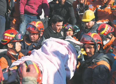 中國救援隊(duì)進(jìn)入現(xiàn)場后迅速進(jìn)行評估與排查,并與土方確認(rèn)搜救方案。最終,經(jīng)過不懈努力,幸存者被搜救隊(duì)員用擔(dān)架從地下室抬出。此時,夜幕已降臨,醫(yī)生給她蓋上特制的金色保暖薄膜,大家打著燈光排成兩行。在眾人簇?fù)硐?,她被送進(jìn)救護(hù)車。也許是因?yàn)榧?,記者聽到她發(fā)出微弱的哭泣聲。