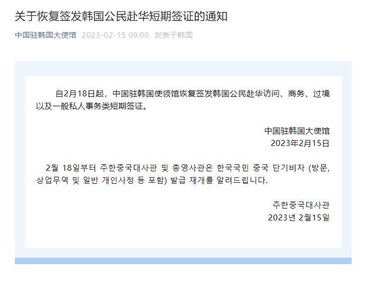 自2月18日起,中國駐韓國使領(lǐng)館恢復(fù)簽發(fā)韓國公民赴華訪問、商務(wù)、過境以及一般私人事務(wù)類短期簽證。