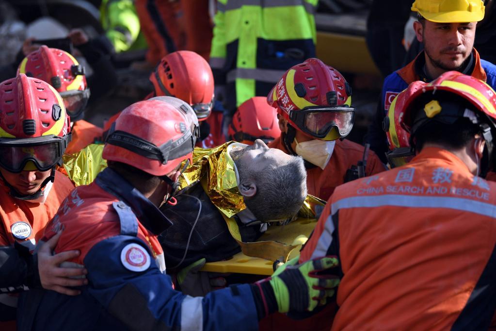 2月12日,在土耳其哈塔伊省安塔基亞市,中國救援隊轉(zhuǎn)移一名救出的幸存者。新華社記者沙達(dá)提攝