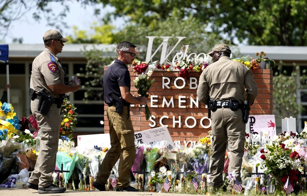 2022年5月27日,警察在美國得克薩斯州南部尤瓦爾迪市發(fā)生槍擊事件的小學外擺放花束。新華社記者吳曉凌攝