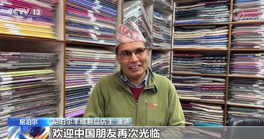 尼泊爾羊絨制品店主 潘迪:歡迎中國(guó)朋友再次光臨,我將提供更多質(zhì)優(yōu)價(jià)美的商品,歡迎中國(guó)朋友來尼泊爾。