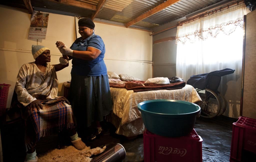 2011年8月23日,在南非約翰內(nèi)斯堡以南約45公里的小鎮(zhèn)奧蘭治農(nóng)場(chǎng),志愿者利迪亞·姆巴洛來(lái)到64歲的艾滋病患者安娜家中幫助她進(jìn)行簡(jiǎn)單的治療。新華社記者費(fèi)茂華攝