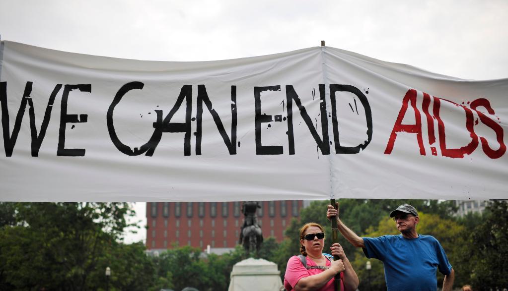 2012年7月24日,在美國(guó)首都華盛頓白宮外,人們舉起“我們能結(jié)束艾滋病”的橫幅。新華社記者張軍攝