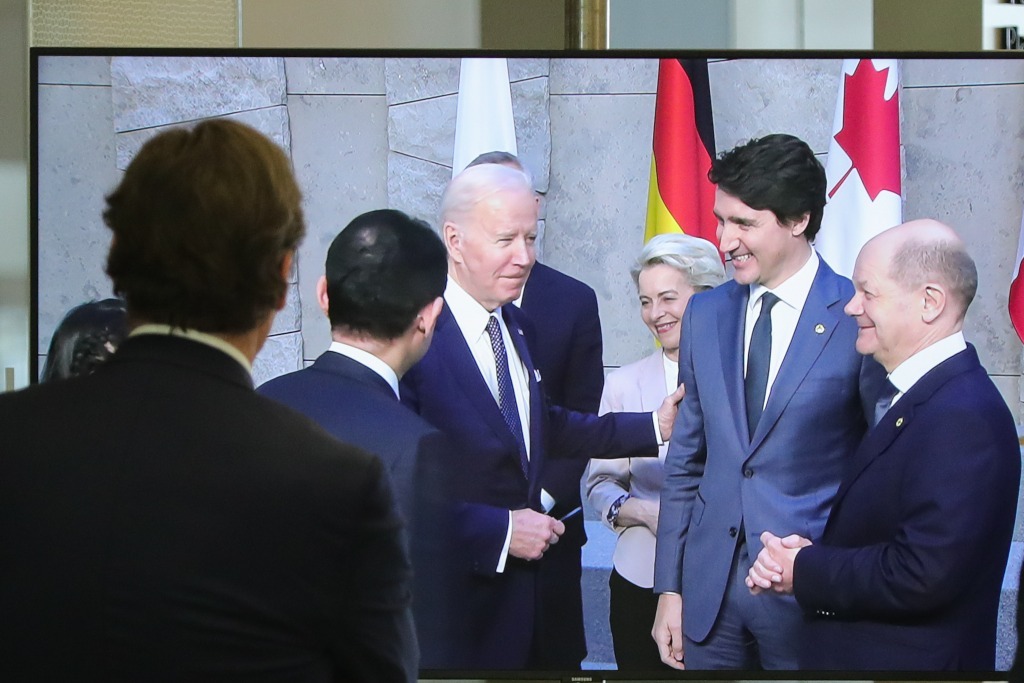 2022年3月24日,在比利時(shí)布魯塞爾的北約總部,一名男子觀看屏幕上美國總統(tǒng)拜登(右四)、歐盟委員會(huì)主席馮德萊恩(右三)、加拿大總理特魯多(右二)、德國總理朔爾茨(右一)出席七國集團(tuán)峰會(huì)合影儀式的畫面。(新華社記者鄭煥松攝)