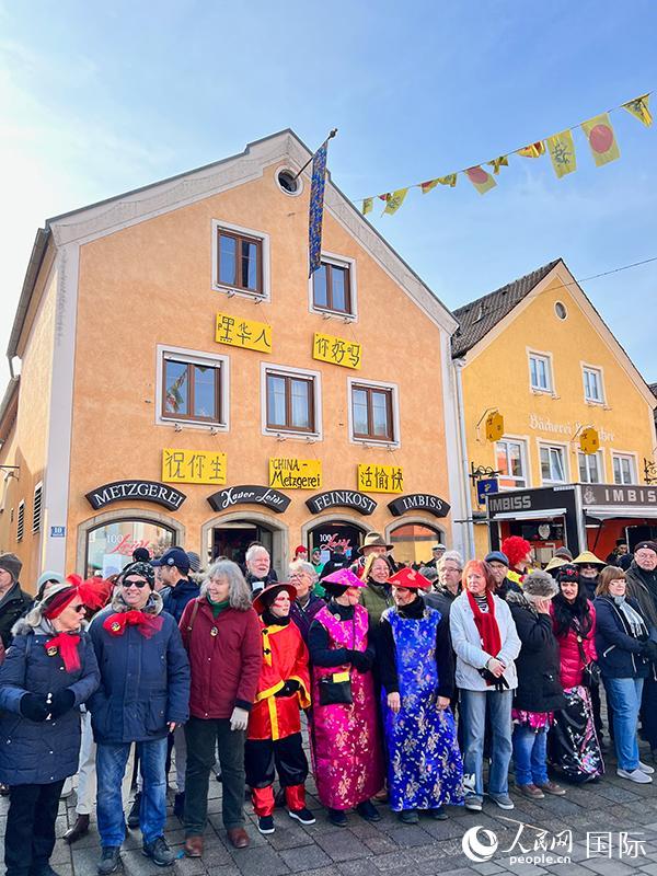 節(jié)日期間的迪特福特,隨處可見中國文化元素。主街兩側(cè)的房屋上,懸掛著“祝你生活愉快““華人你好嗎”等漢語招牌,街道上方則拉起了彩旗和紅燈籠;市政廳前不但搭起巨大的中式戲臺,平時經(jīng)營德國風(fēng)味的面包店和肉店,也都把招牌換成了“中國面包店”“中國肉店”,并張貼著“?!薄暗摗薄皦邸钡燃橛谜Z,游客在攤位前排起長龍,津津有味地吃著“中國甜甜圈”。