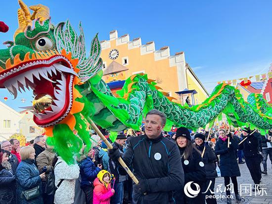 他們有的穿著自行設(shè)計的旗袍馬褂,邊走邊向觀眾分發(fā)糖果和熱紅酒;當?shù)毓軜逢牬┲B(tài)可掬的熊貓服裝,吹奏起巴伐利亞民歌;由當?shù)厣鐖F組成的舞龍隊,吸引了很多小朋友的注意,領(lǐng)頭的德國大叔還把龍頭放低,跟小朋友親切互動;由旅德華人組成的華星藝術(shù)團方陣,憑借各色中國民族服裝展示,贏得了觀眾的熱烈掌聲。