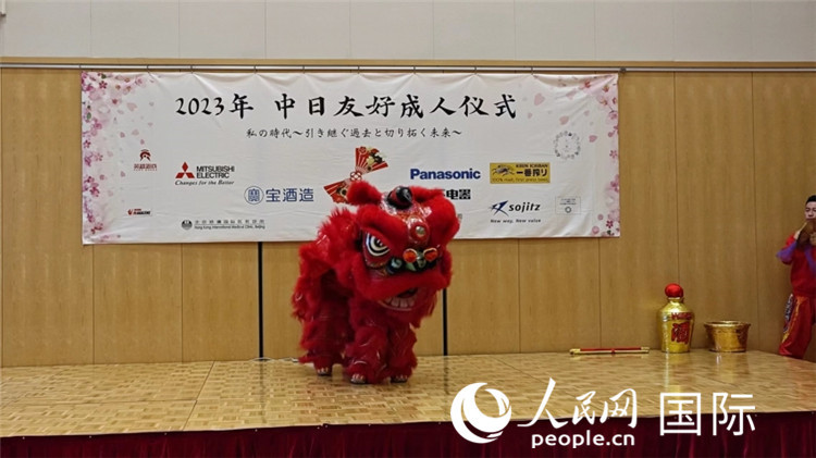 今年約有140位18至22歲的中日青年來到成人儀式現(xiàn)場。儀式中不僅舉行了日本傳統(tǒng)的鏡開儀式(即用木槌敲開清酒酒桶的蓋子,祈愿“開運”),BJBJ樂團的演奏和中國傳統(tǒng)的舞獅表演更是將氣氛推向了高潮。