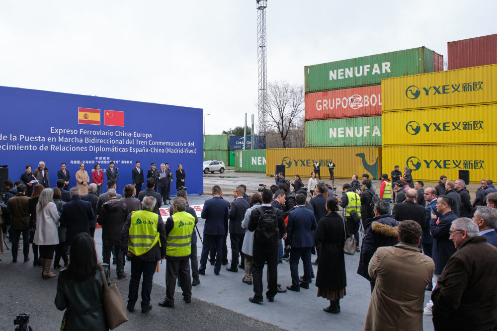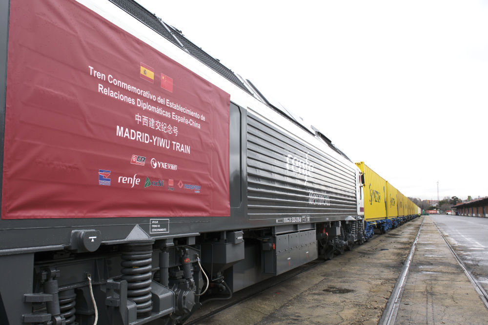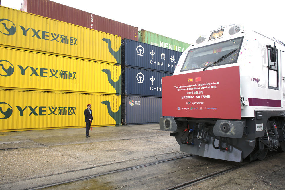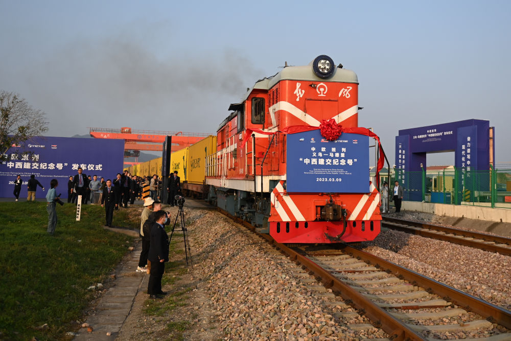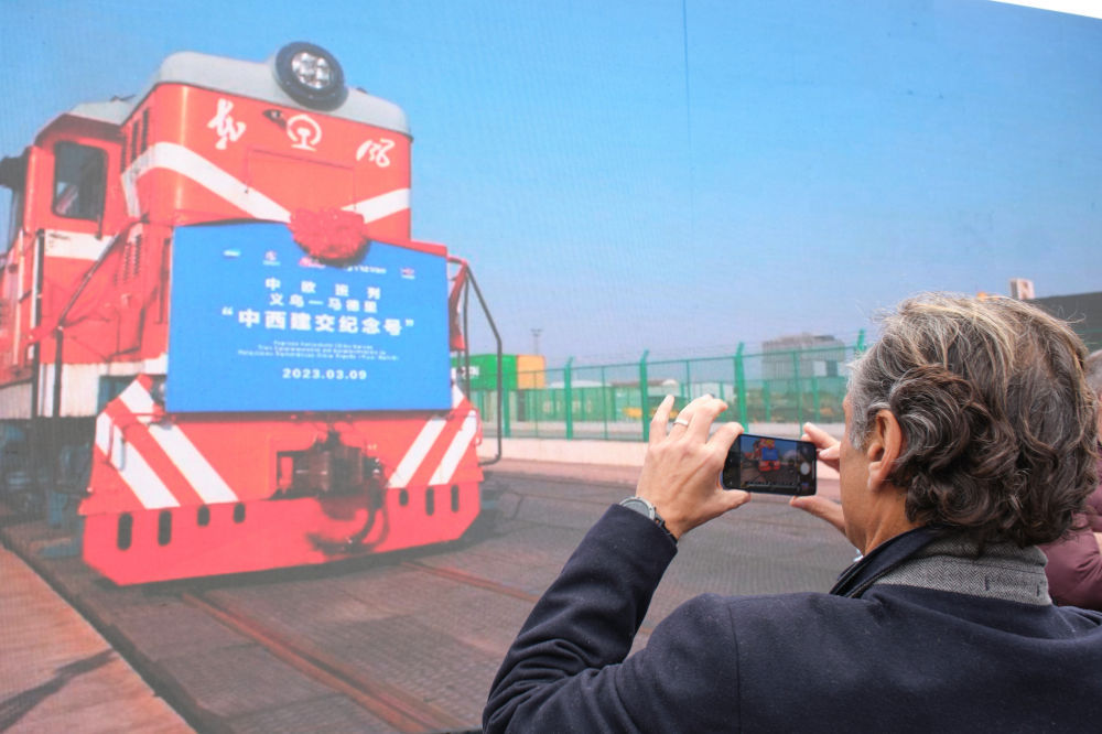 3月9日,以“中西建交紀(jì)念號”特別命名的“義新歐”中歐班列從西班牙首都馬德里鳴笛發(fā)車,與從中國義烏同時開出的列車雙向而行,以慶祝中西建交50周年。