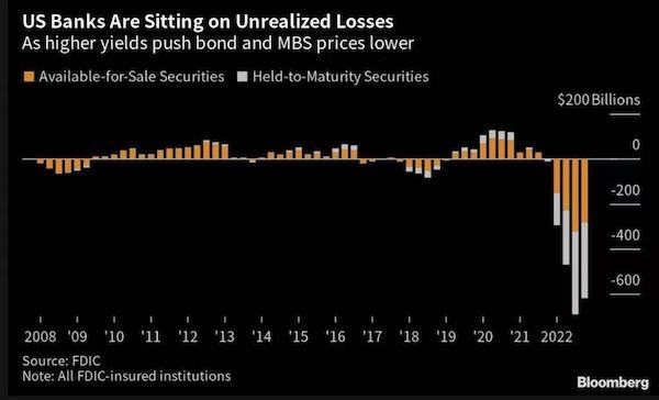 彭博數(shù)據(jù)顯示,美國銀行在短短數(shù)日內(nèi)吸收了超過150億美元新存款,成為硅谷銀行等三家美國規(guī)模較小的銀行倒閉后最大的贏家之一。由于擔(dān)心危機(jī)蔓延,尋求避險(xiǎn)的儲戶紛紛涌向被視為“大到不能倒”(too big to fail)的一些大銀行。接近美國銀行的人士對記者表示:“在目前的情況下,銀行并不會因?yàn)楂@得大量存款而感到高興,以前還可以進(jìn)行同業(yè)拆借來將資金融出,現(xiàn)在同業(yè)的流動性情況都差強(qiáng)人意,因而只能投資美債,但目前美債的情況亦充滿不確定性?!盕DIC數(shù)據(jù)顯示,據(jù)估算,截至去年底,所有美國銀行的可供出售和持有至到期的投資組合未實(shí)現(xiàn)虧損總計(jì)為6200億美元。