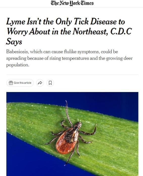 “這種疾病正在向北蔓延,”波士頓塔夫茨醫(yī)療中心巴貝斯蟲病專家愛德華·范尼爾稱,喜歡溫暖潮濕環(huán)境的蜱蟲正向北擴展其生活領地。范尼爾還強調了擴大對該疾病的監(jiān)測和篩查的必要性。