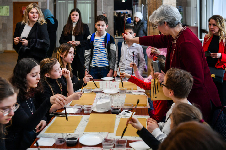 3月3日,在莫斯科國(guó)際關(guān)系學(xué)院,小朋友們?cè)谥袊?guó)文化體驗(yàn)活動(dòng)上學(xué)習(xí)使用毛筆。新華社記者曹陽(yáng)攝