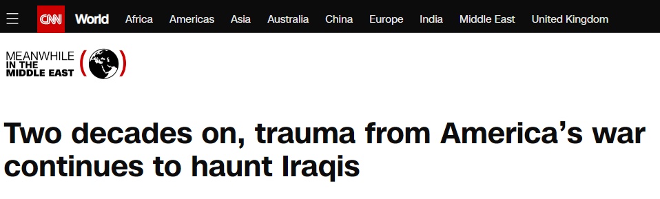 美國有線電視新聞網(wǎng)(CNN)20日刊文稱,美軍入侵伊拉克,在這里部署軍事基地、檢查站和軍隊,實施長達(dá)8年的占領(lǐng)。隨之而來的并不是和平,而是令伊拉克陷入內(nèi)戰(zhàn),被暴力沖突和分裂所淹沒。雖然已經(jīng)過去了20年,但美國發(fā)動的這場戰(zhàn)爭所帶來的創(chuàng)傷依然縈繞在伊拉克人的心頭。