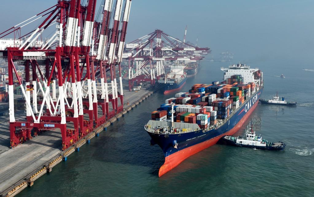 2023年1月1日,滿載集裝箱的法國“達飛阿瑪維瓦”輪正在靠泊青島港前灣QQCT集裝箱碼頭(無人機照片)。新華社記者李紫恒攝