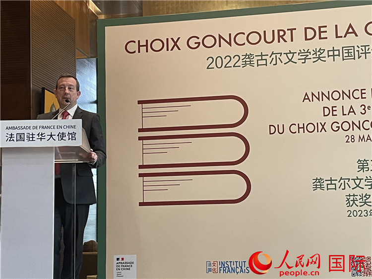 人民網北京3月29日電 (謝瑩、孫鴻宇)3月28日,第三屆“龔古爾文學獎中國評選”新聞發(fā)布會在法國駐華大使館舉辦。法國駐華大使白玉堂出席并宣布獲獎作家。龔古爾獎中國評選顧問杜青鋼教授以及兩位學生評委代表參與發(fā)布會并點評獲獎作品。