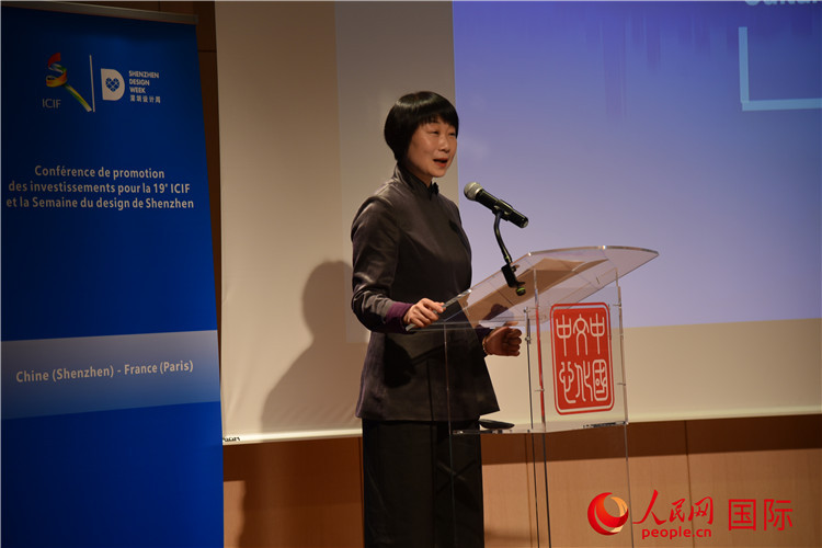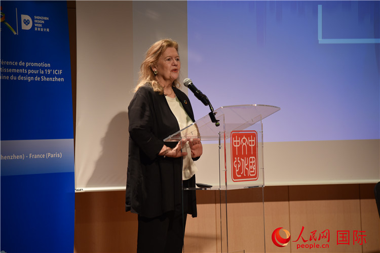 法國工業(yè)設(shè)計協(xié)會主席安妮·瑪麗·薩赫格耶致辭。人民網(wǎng)記者 劉玲玲攝 |