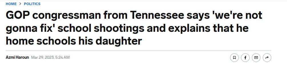 據(jù)美國(guó)《商業(yè)內(nèi)幕》新聞網(wǎng)站29日?qǐng)?bào)道,田納西州納什維爾市小學(xué)發(fā)生槍擊事件后,該州眾議院議員蒂姆·伯切特面對(duì)如果出現(xiàn)類似槍擊事件“該如何保護(hù)孩子”的質(zhì)問(wèn),直言并未找到解決方法,會(huì)讓他的女兒“在家讀書”。