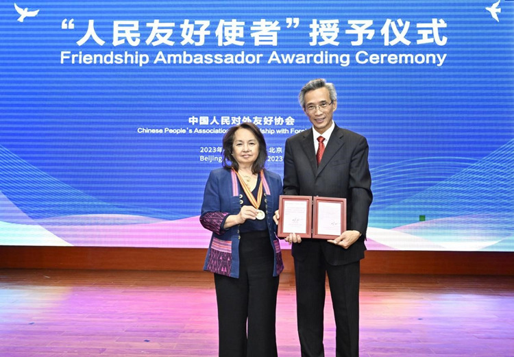 中國(guó)人民對(duì)外友好協(xié)會(huì)會(huì)長(zhǎng)林松添向菲律賓前總統(tǒng)阿羅約頒發(fā)“人民友好使者”獎(jiǎng)?wù)录白C書。 中國(guó)人民對(duì)外友好協(xié)會(huì)供圖