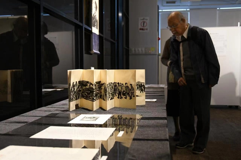 一名參觀者在“和平之心——穿越時(shí)空的友情”版畫展現(xiàn)場(chǎng)欣賞作品。