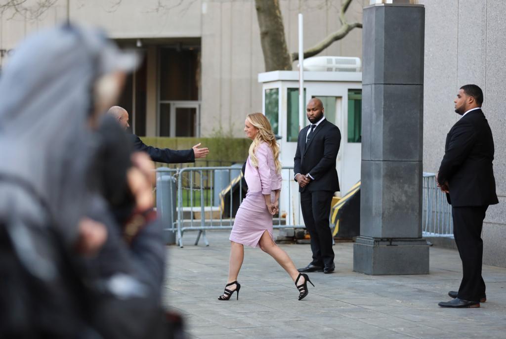 2018年4月16日,在美國紐約曼哈頓聯(lián)邦地區(qū)法院外,艷星丹尼爾斯(右三)出庭后準(zhǔn)備離開。新華社記者王迎攝