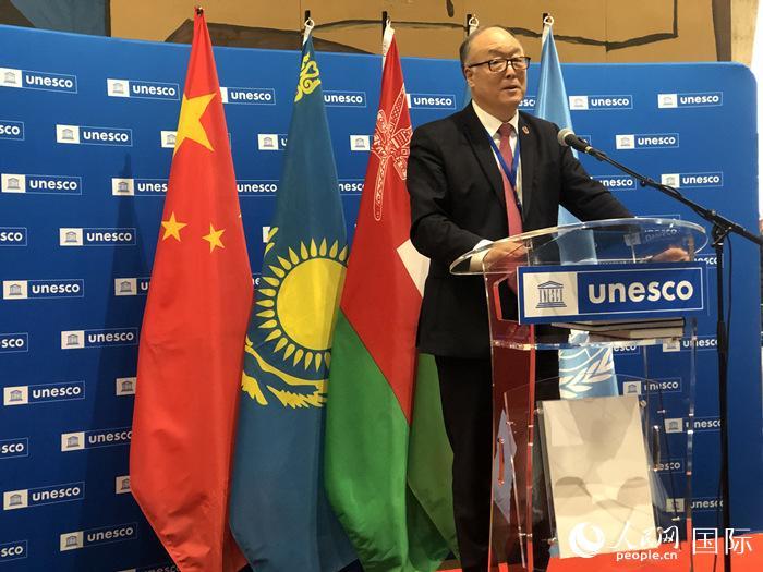 中國常駐聯(lián)合國教科文組織代表楊進(jìn)在絲綢之路杰出藝術(shù)作品展覽推介儀式上致辭。人民網(wǎng)記者 劉玲玲攝 |