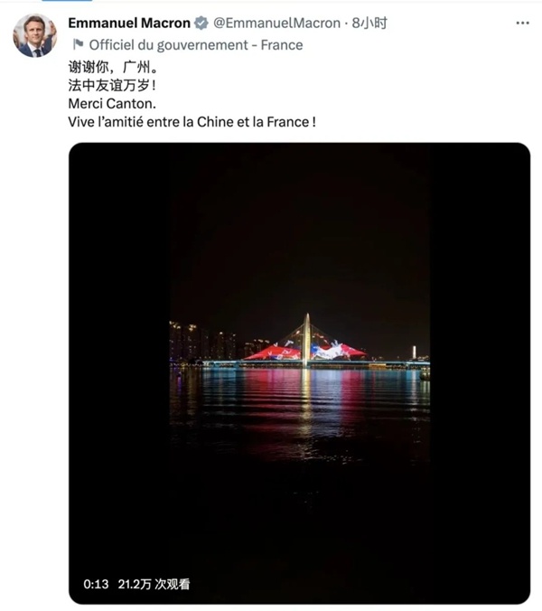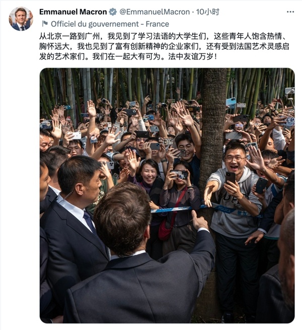 結(jié)束訪(fǎng)問(wèn)離開(kāi)中國(guó)之際,馬克龍連發(fā)四條推特,連說(shuō)好幾遍“法中友誼萬(wàn)歲”,激動(dòng)之情溢于言表。