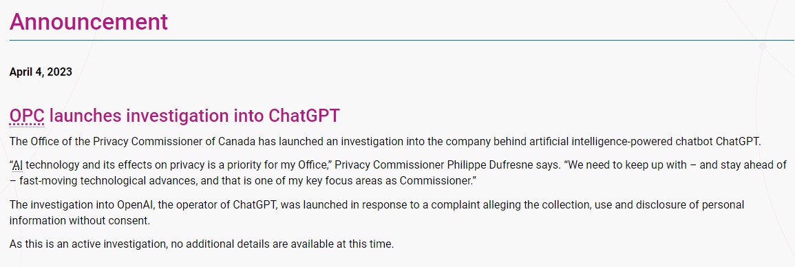 人民網(wǎng)訊 據(jù)加拿大廣播公司(CBC)當(dāng)?shù)貢r間4月4日報(bào)道,加拿大隱私專員辦公室(Office of the Privacy Commissioner,OPC)宣布,由于OpenAI公司涉嫌“未經(jīng)同意收集、使用和披露個人信息”,已經(jīng)對該公司展開調(diào)查。