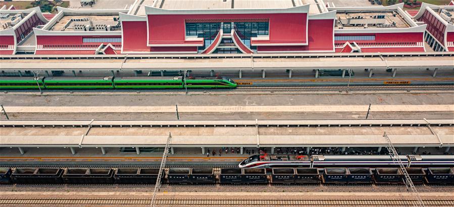 4月13日,“復(fù)興號(hào)”(上)、“瀾滄號(hào)”動(dòng)車組列車??吭谥欣翔F路磨憨站(無人機(jī)照片)。新華社記者 胡超 攝