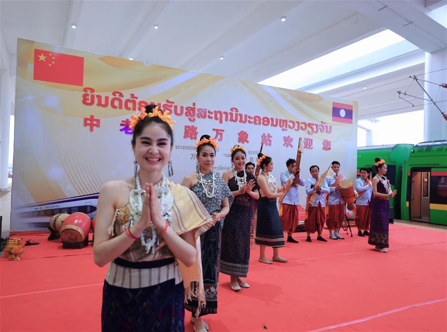 4月13日,在老撾萬象站,工作人員歡迎乘坐D887次國際旅客列車的旅客。新華社記者 邢廣利 攝