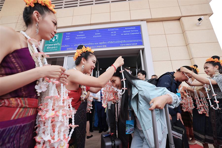 4月13日,乘坐D887次國際旅客列車的旅客抵達(dá)老撾萬象站。新華社記者 邢廣利 攝
