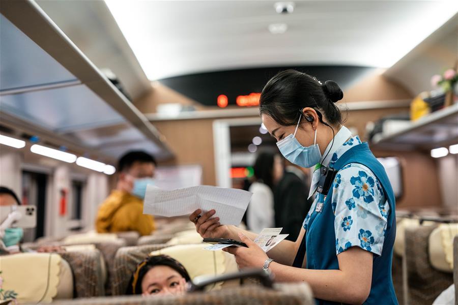 4月13日,首發(fā)列車乘務(wù)員在列車上查驗(yàn)車票。新華社記者 胡超 攝